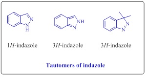 Indazole is an organic heterocyclic compound called isoindazole or benzo[c]pyrazole, 1,2-benzodiazole [1]. The discovery of indazolering was invented by Emil Fisher calling them fused benzene and pyrazole ring [2-3]. The continuous research on indazole is due to its interesting chemical and biological properties. Indazole belongs to azole family and the presence of 10π electron in the ring of indazole, makes them aromatic character similar to other heterocyclic aromatic compounds like indole, pyrimidine and pyrrole. The indazole exists in 1H-, 2H- and 3H- three tautomeric in nature (Figure 1) [4].
