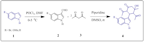 Initially, we started our strategy for the preparation of diacetyl, hydroxy-indole, methylcyclohexanone derivatives (Scheme 1), (4A-4C). In the present investigation, the synthesis of 2,4-diacetyl-5-hydroxy-3-(1H-indol-3-yl)-5-methylcyclohexanone analogs (Scheme 2, Figure 3) was performed by using modified aldol condensation reactions of heteroaromatic aldehydes and acetylacetone in DMSO solvent yielded intermediate cyclohexanones in excellent yields [32-33] (Scheme 2). When indole-3-carbaldehyde was stirred with acetylacetone in the presence of base heterocyclic amine (20 mol%) produce a precursor 1-3 analogs in excellent yields.