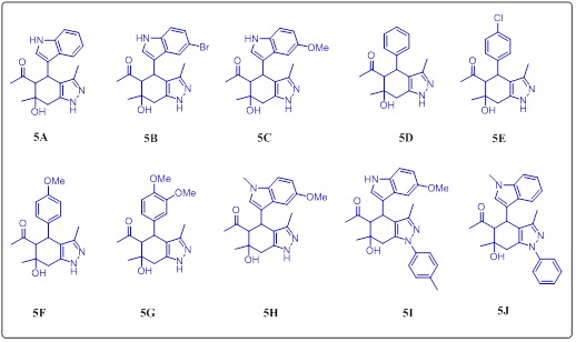 Synthesized scaffolds were characterized by numerous spectroscopic techniques. In the IR spectrum of analogstetrahydro-1H-indazol-5-yl) ethan-1-one5A showed the IR signal appear at 3346 and 3292indicate presence of N-H and OH functional group. The IR signal that appears at 1693 is a stretching signal for the carbonyl group. In 1H NMR spectrum of product, 5A showed a signal at δ 12.32 (s, 1H) and 5.33 (s, 1H), corresponding to N-H, D2O exchangeable proton, and one singlet at δ5.55 s, 1H for OH, which is D2O exchangeable proton. One singlet at 6.73 s, 1H belongs to the proton of indole CH. There are three singlets for three CH3groupsthatappear at δ1.27, s, 3H, δ1.99 s, 3H, δ1.97 s, 3H. In 13C NMR the signal at 202.23 corresponds to an acetyl carbonyl group. Finally, in mass spectroscopy (ESI) m/z (M+H) calculated 323.1634observed at Exact Mass: 324.16 The product formation was established by 1H, 13C NMR analytical techniques. On the basis of characterization reports and their evaluation using numerous techniques, the structure of product 5A was assigned. The compound 5C showed the FTIR band at 3412, 3057 indicating the presence of Oh and N-H functionalities in the compound. The 1HNMR 1H NMR (300MHz, dmso) show the δ 6.98 (d, J = 8.7 Hz, 2H), 6.73 (d, J = 8.7Hz, 2H), 4.00 (d, J = 10.9 Hz, 1H), 3.69 (s, 3H), 2.86 (d, J = 11.0 Hz, 1H), 2.71 (dd, J = 36.1, 16.5 Hz, 2H), 2.51 (s, 1H), 1.65 (s, 3H), 1.48 (s, 3H), 1.23 (s, 3H). The 13C (75 MHz, DMSO) 216.56, 158.38, 133.86, 129.14, 114.04, 113.48, 71.63, 64.10, 55.11, 40.92, 36.66, 34.39, 28.63. M. F. C18H22N2O3, Exact Mass: 314.1630, obtained; 314.9. On the basis of the evaluation report using spectral techniques, the structure of scaffold 5C was assigned.