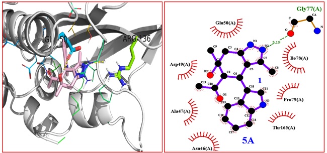 From the literature data, it was found that the given compounds are active against the cancer research, therefore we decided to perform the molecular docking of 21-(6-hydroxy-4-(1H-indol-3-yl)-3,6-dimethyl-4,5,6,7-tetrahydro-1H-indazol-5-yl) ethan-1-one 5A-5J compound with 1kzn protein. In order to understand the nature of interactions of ligands, we have carried out molecular docking analysis by using Autodock software (Dallakyan S. et al. 2015). The 1kzn protein is known as DNA gyrase enzyme. The DNA gyrase is a most of the protein is the bacterial enzyme which takes part in the biochemical process like transcription and copying new stand, that enhances the formation of negative DNA supercoil of bacteria. The DNA gyrase is the representative target for the antibacterial agents it blocks the formation of new copying DNA, which results in bacterial death. The three-dimensional crystal structure of crystal structure of 1kzn was retrieved from the Protein Data Bank (http:// www.rscb.org/pdb). [31] The native ligand (E)-3-(3,5-Difluoro-4-((1R,3R)-2-(2-Fluoro-2-Methylpropyl)-3-Methyl-2, 3,4,9-Tetrahydro-1H-Pyrido[3,4-B]Indol-1Yl)Phenyl) Acrylic Acid (Azd9496) was deleted before CADD study. The active sites/ binding sites of the protein were identified using the Computed Atlas of Surface Topography of Proteins (Castro) program (http: //cast.engr.uic.edu) [34] The compound 5A-5J is well accommodated in the binding sites of 1KZN protein. While the compound 5A is also well accommodated in the binding sites of 1kzn protein and shows -7.9 kcal/mol binding energy and exhibit hydrogen bonding with Gly-77 amino acids and the molecule shows van der Waals of interaction with amino acid residues like FLU-50, ASP-4, ALA-47 ASN-46, THR-165, PRO-79, IIL- amino acids (Figure 4).