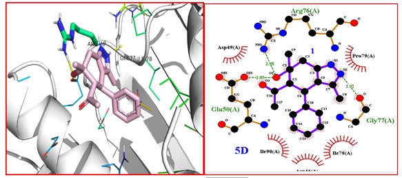 The compound 5D is well accommodated in the binding sites of 1KZN protein. While the compound 5D is also well accommodated in the binding sites of 1kzn protein and shows -7.0 kcal/mol binding energy and exhibit hydrogen bonding with ARG-76, 2.98 GLU-50 2.85, GLY-77, 2.92 amino acids.