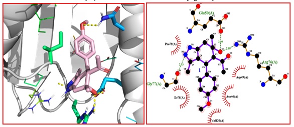 The ligand shows H-bond with ARG-76, having bond distance NH---O 2.98 Å, the amino acid GLU-50 show H- bond with H---OH having h-bond 2.85 Å and amino acid GLY-77, display H-bond with N---OH having distance 2.85 Å and the molecule shows van der Waals of interaction with amino acid residues like IlE-90, IlE-78, PRO-9, ASP-49 amino acids (Figure 5).